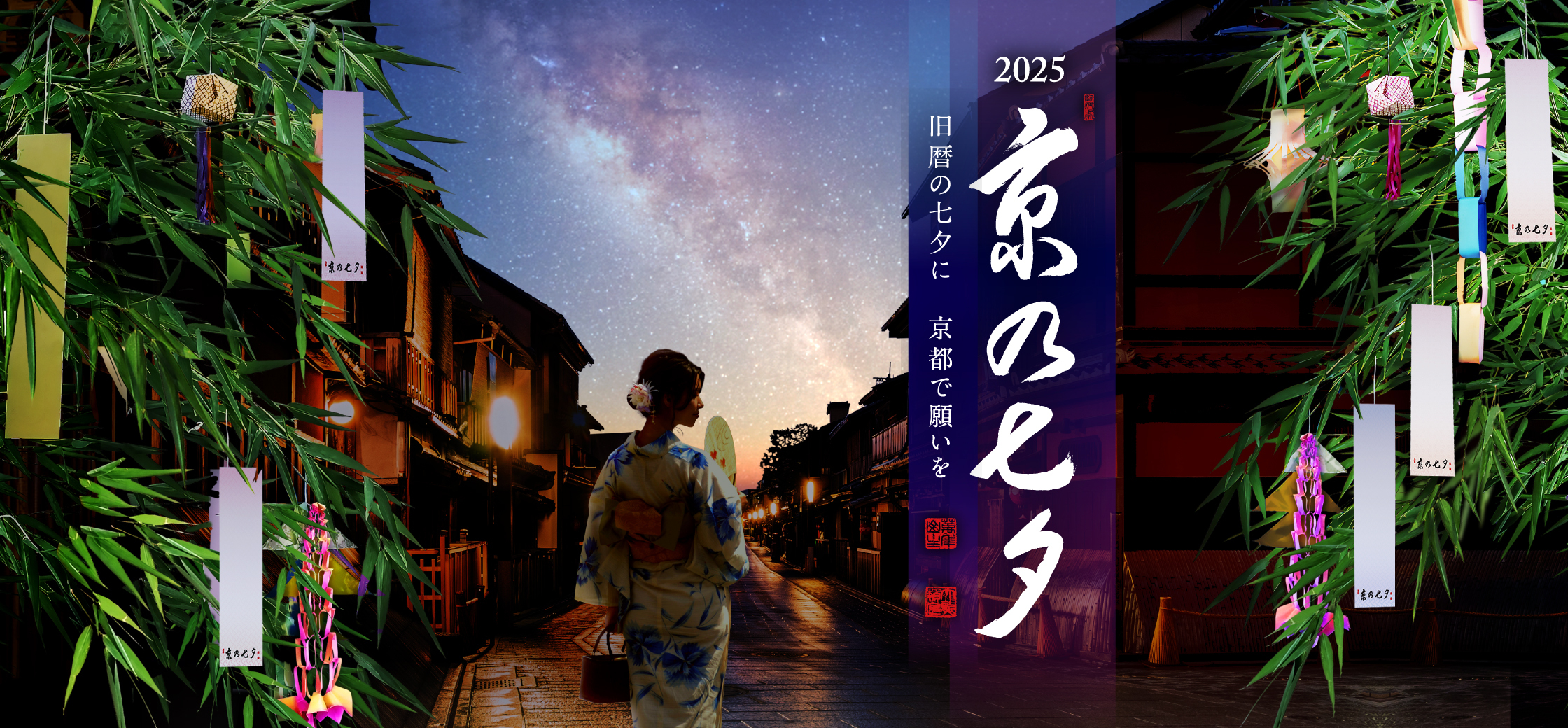「京の七夕実行委員会」の事務局を担い、旧暦の七夕にちなみ8月上旬に、「祈り」や「願い」をテーマに、京都各所で行われる民間や各種団体の主催する「京の七夕」協賛イベントに対して、広報と情報の収集・発信を行っています。また、笹飾りや短冊の配布等の事業支援を行い、夜観光、宿泊観光の促進につなげています。