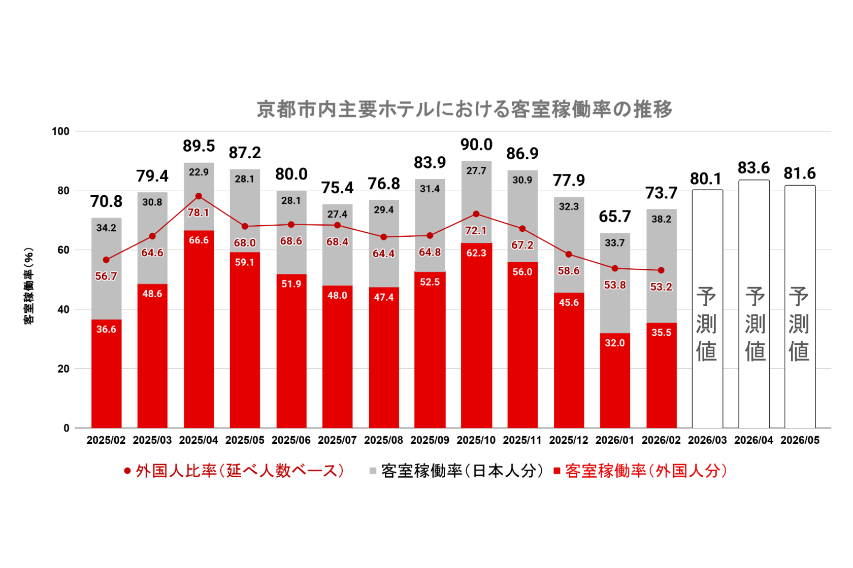 このたび、京都市観光協会データ月報(2026年2月)をとりまとめましたのでお知らせします。今回のホテル統計の対象施設数は114軒、旅館統計の対象施設数は22軒です。