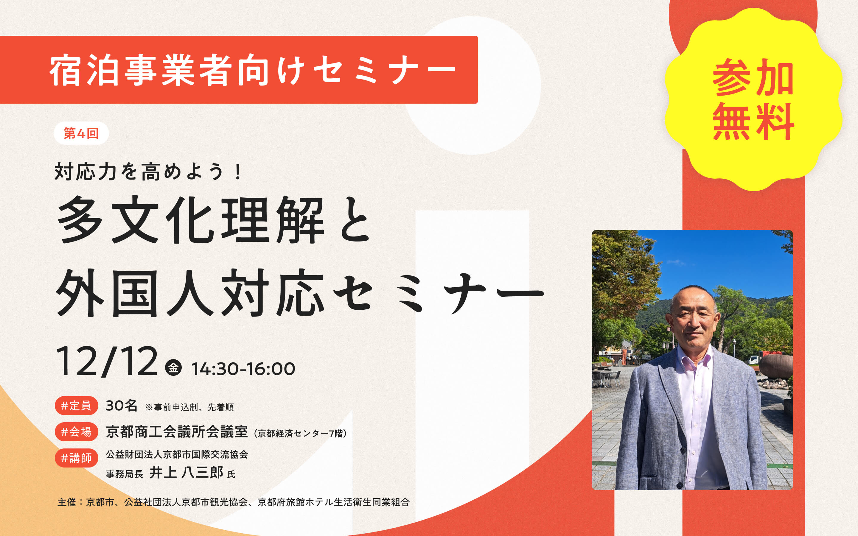 京都市と京都市観光協会及び京都府旅館ホテル生活衛生同業組合では、担い手不足が続いている宿泊事業者を支援していくため、担い手の確保や定着、労働環境の向上などをテーマに、京都市内の宿泊事業者、宿泊関連事業者、その他業界に関心のある方を対象とした「宿泊事業向けセミナー」を開催します。みなさまのご参加をお待ちしております!