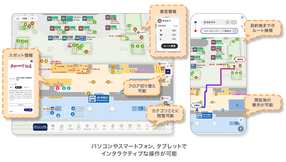 | 2025年(令和7年)9月 | 手ぶら観光の推進に向けた取り組み「京都駅デジタルマップ~Kyoto Station Smart Navi~(駅スマ)」の導入 主体:京都市・京都市観光協会 ![]() |